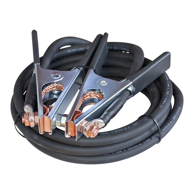 Zestaw (2 szt.) przewodów rozruchowych, do zastosowań profesjonalnych, wykonany jest z przewodu typu OnS (H01N2-D) 100/100V (miedziany przewód spawalniczy) o długości 5 m każdy, przekroju żyły 35 mm2, w osłonie gumowej, do stosowania w temperaturach od -25°C do +80°C.