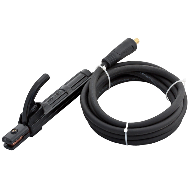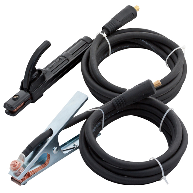 Zestaw 2 szt. miedzianych przewodów spawalniczych typu OnS (H01N2-D) 100/100V z uchwytem elektrodowym i zaciskiem masowym, o długości 3 m każdy (przekrój żyły 25 mm2) w osłonie gumowej do stosowania w temperaturze od -25°C do +80°C.